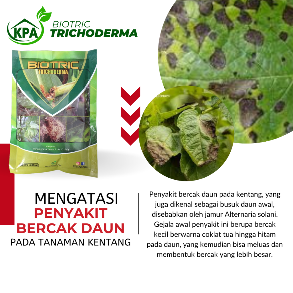 Pengendalian penyakit bercak daun tidak cukup hanya mengandalkan fungisida kimia. Pendekatan yang lebih berkelanjutan melalui pemanfaatan agen hayati seperti Trichoderma menjadi solusi yang efektif dan ramah lingkungan. Dengan cara kerja yang menekan patogen, meningkatkan kesehatan tanah, serta memperkuat ketahanan tanaman, produk berbasis Trichoderma dapat menjadi bagian penting dalam strategi pengendalian penyakit kentang.