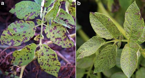 Selain itu, bercak pada daun kentang juga dapat disebabkan oleh jamur Alternaria solani yang menyebabkan penyakit bercak kering (early blight). Penyakit ini biasanya muncul pada tanaman yang sudah agak tua atau saat kondisi tanaman kurang sehat.